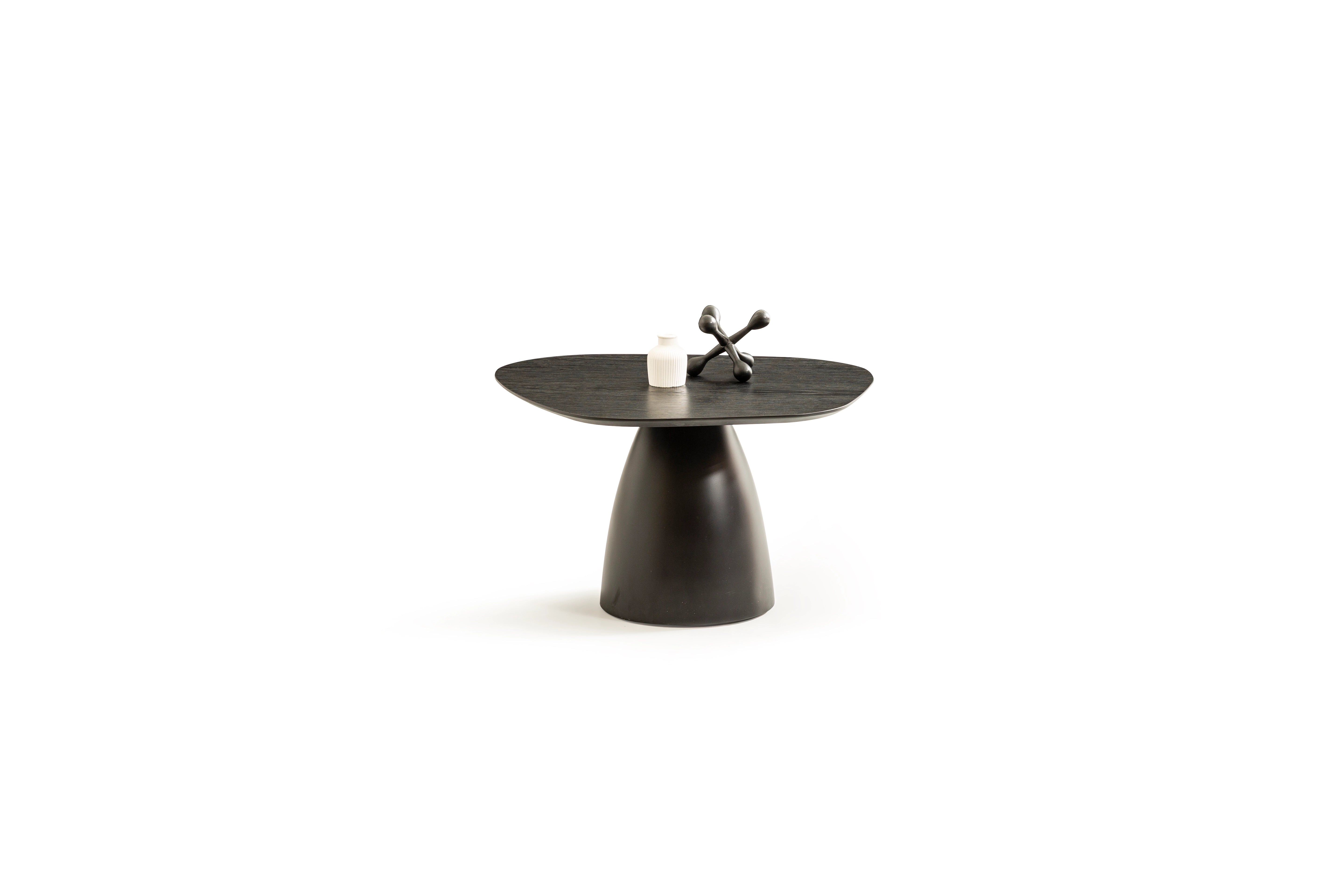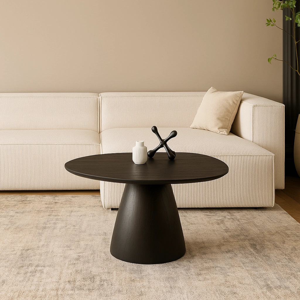 Dieser elegante Couchtisch in hochwertiger Eichenoptik vereint modernes Design mit warmer, natürlicher Ausstrahlung. Die organisch geformte Tischplatte ruht auf einem konischen Fuß, der dem Tisch Stabilität und eine skulpturale Präsenz verleiht.