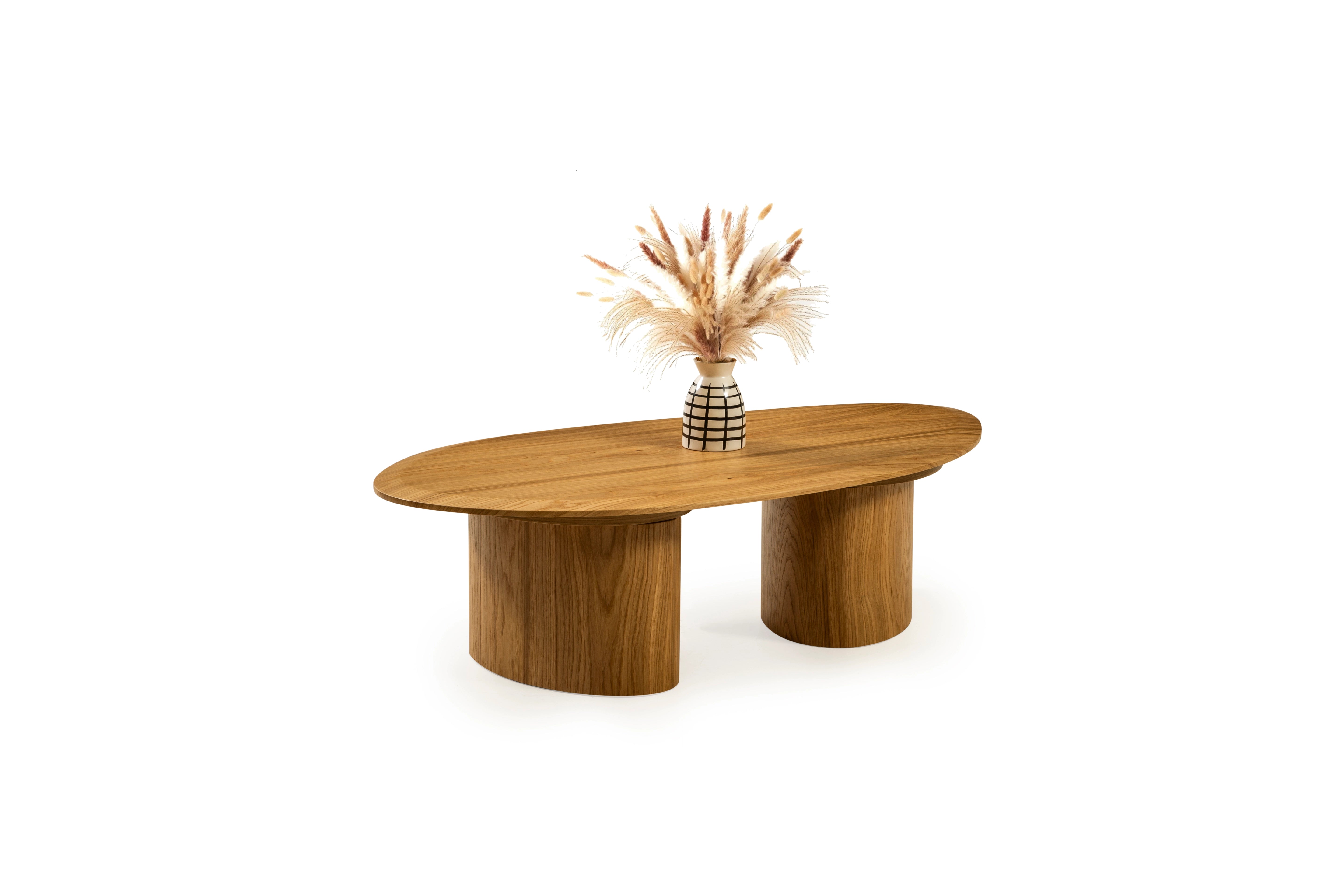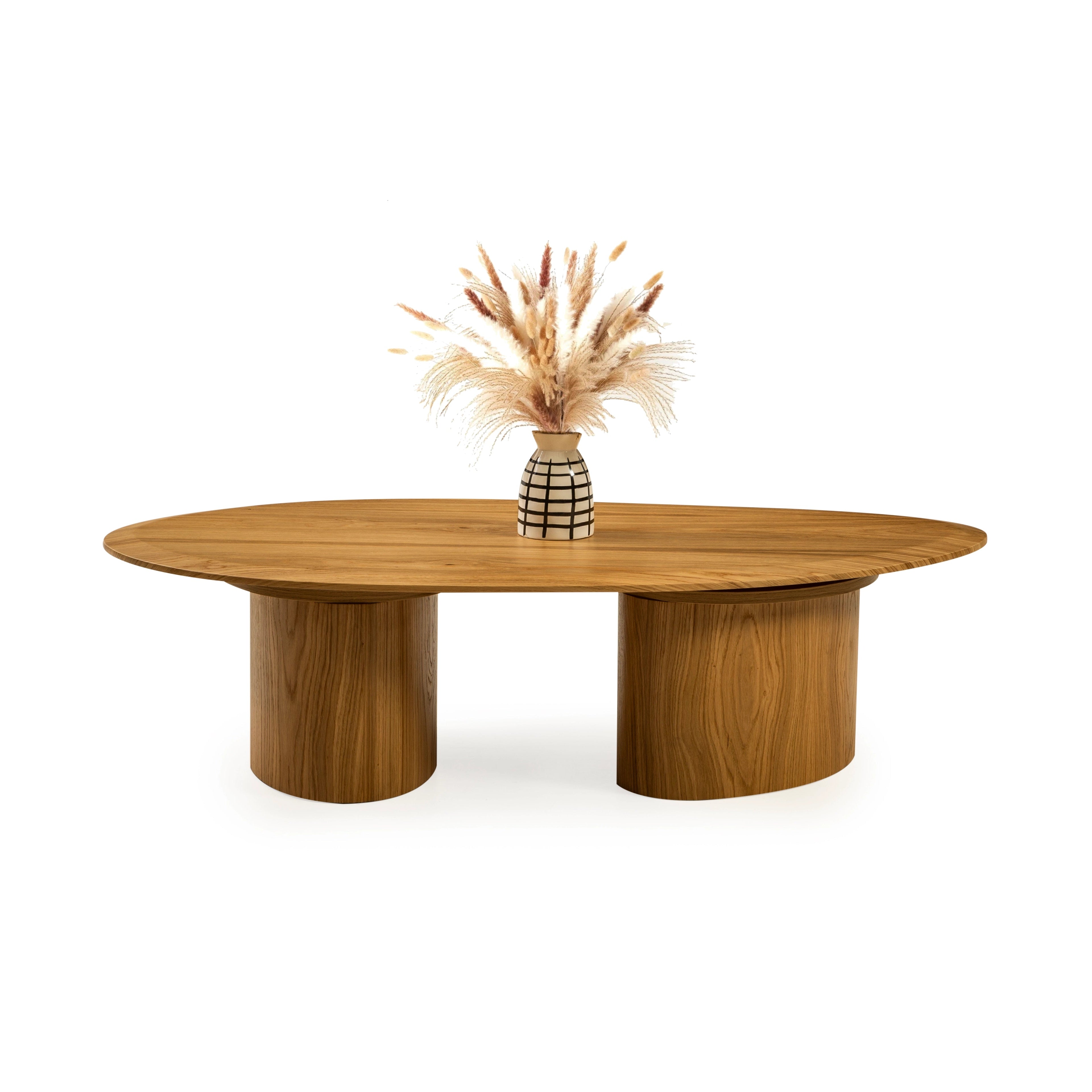 Getragen wird sie von zwei markanten, halbrunden Säulenfüßen, die dem Tisch eine skulpturale Wirkung und besondere Stabilität verleihen. Die harmonische Kombination aus natürlicher Holzoptik und moderner Linienführung macht diesen Tisch zum stilvollen Mittelpunkt jedes Wohnzimmers – zeitlos, hochwertig und vielseitig kombinierbar.